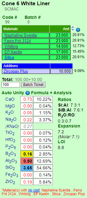 It was originally formulated with 16% zircopax, but I had to switch to zircopax plus when I began my MA program at CSU Northridge. I found that 10% made for a nice substitution, and gave me a nice gloss finish that was opaque enough.
