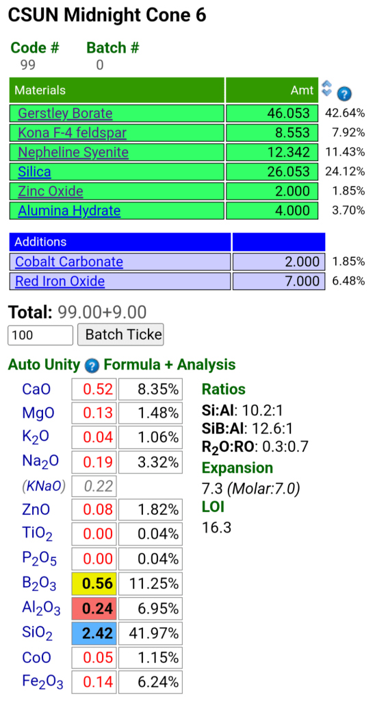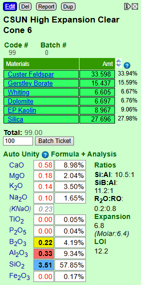 It has a relatively high expansion, but it fits my clays nicely enough. My only gripe with this recipe is that it require epsom salts to keep from hard-panning.