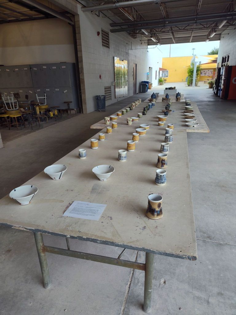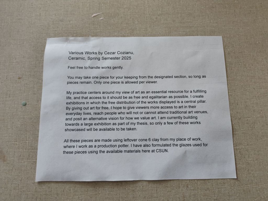 I overlooked the display until all 8 available pieces were given away. I was reassured that people were pretty eager to get a free pot, as I had a tougher experience giving away pieces to the CSUN faculty during my first review. Some people had trepidations at first, but seems genuinely excited after I reassured them that the pieces were there to be taken.